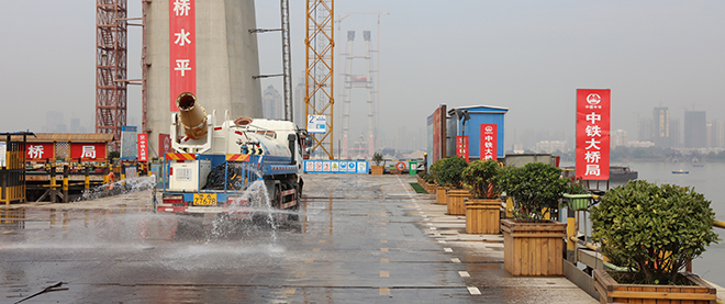 工程代建单位道桥公司有关负责人介绍:“我们这个工地的特点就是绿色环保,对扬尘严格控制,通过营造景观、种植树木提高工地的‘颜值’,让工地变成花园。”在武昌岸的施工现场,花草树木都被搬上了临时搭建的钢栈桥。为了提高花草树木成活率,特别选用了成活率高的黄杨球、铁树等,并按照季节更换花草,还安装了自动灌溉系统。