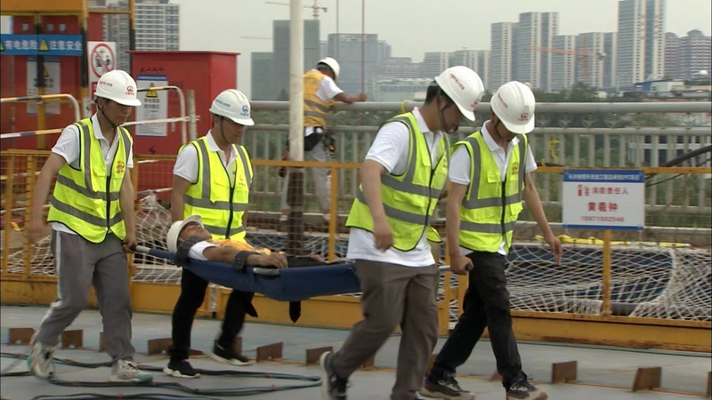 科目二:长丰桥正常施工时桥面突发火情,现场管理人员立即组织灭火,同时撤离施工人员。钢横梁涂装工人撤离过程中不慎失足落水、主拱圈脚手架上施工人员在撤离过程中腿部受伤,丧失自主逃生能力,救援队协助开展救援行动。