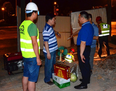 8月1日晚9时,光谷智能公司董事长吴丹带队,来到位于青山区工业四路的武汉市智慧交通示范项目施工工地,慰问夜幕下的一线施工人员,为他们送去防暑降温物品。