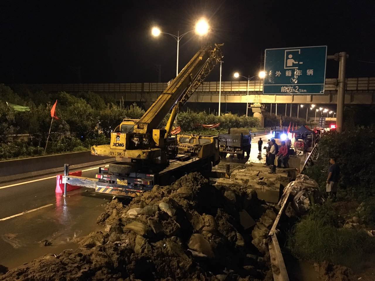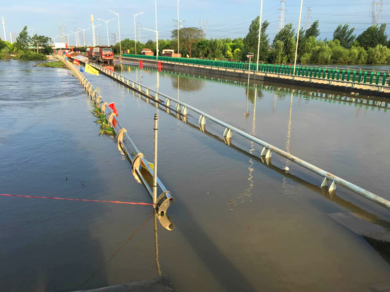在水位持续上涨并已漫过桥面的情况下,一边抓紧与交管部门沟通协商封路事宜,一边组织现场人员进行交通疏导。同时,兄弟单位水务集团、燃气集团也及时对小河桥现场水气管网情况进行了安全排查。22时,交管部门对三环北(三金潭――谌家矶)实行交通封闭,现场立即调用2台装载机、3台挖掘机、2台吊车、2台叉车开始进行封堤围堰施工。由于准备充分,经过紧张组织施工,23时50分完成封堵和围堰加固工作。