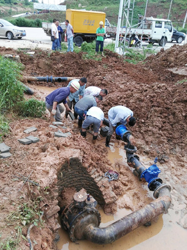 水务集团按照城投公司“全力保障受灾群众生活”的部署要求,选派干部带队,抽调骨干立即赶赴现场,经勘查后迅速确定启用开发区新装的DN400管道。施工人员克服暴雨如注、深夜施工等困难,经过10多个小时的连续奋战,至7月3日18时,管道冲洗后水质经检验合格,于晚上21时正式通水,保证了周边企业和村民的生产生活用水,受到了当地政府和居民群众的赞扬。