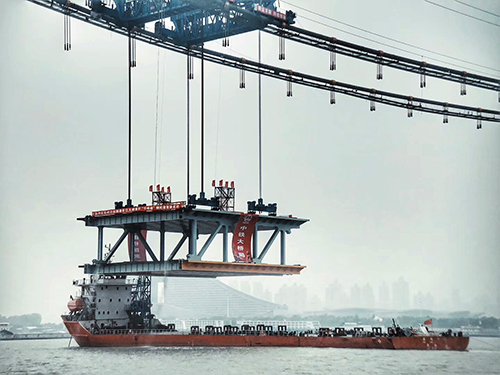 2018年11月15日上午8点,随着两台缆载吊机将长36米、宽32.5米、高10米,重约1004吨的钢桁梁提升到距离江面60米的位置,由探花