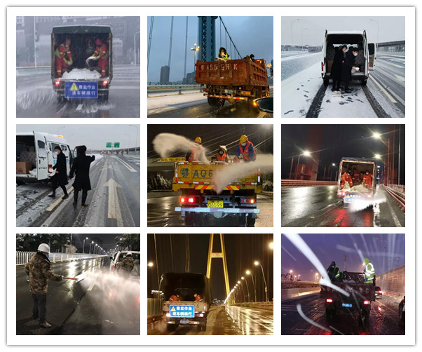公司承担全市13座跨江桥梁以及三环线东段、北段、南段共计84.7公里路段的融雪防冻任务。组织所属城运公司、天兴洲道桥公司、桥建集团、铁投公司、誉城集团等单位成立应急抢险队伍,调配312人,机械设备50台,全方位做好融雪除冰工作。此外,公司所属新区公司、临空投集团还分别支援和承担汉阳国博中心洲际酒店上下匝道、临空新城和巨龙大道立交及附近区域内路段的融雪防冻任务,保障防疫应急工作车辆正常通行。