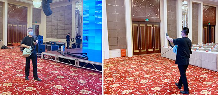 一进酒店,门口有一台红外线体温测量仪,人员进入必须测量、扫码,绿码方可进入。在举办活动的国际会议中心3楼和5楼会场,工作人员正在进行喷雾消杀。“会议前两天起,每天定时对会场全面消毒。” 武汉洲际酒店副总经理黄娟介绍,1.8米长的会议桌,以前坐3人,现在只安排坐2人,既方便与会者之间沟通交流,又能保障座位间的安全距离。