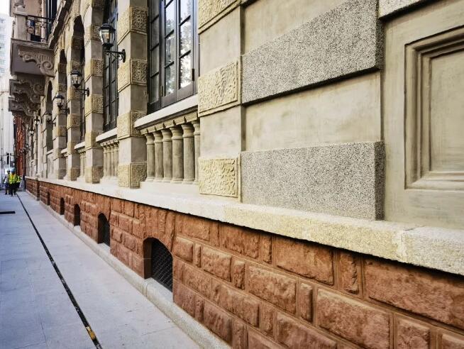 除了红砖清水墙,水刷石线条也是巴公房子外墙画龙点睛之笔。尽管这种装饰线条在近现代古建筑上较为常见,但看似简单的修饰线条修复起来并不简单。天时公司施工人员在清理原有线条基层后,再对其表面进行凿毛处理,为确保水泥砂浆附着牢固,在涂抹水泥砂浆前,还需刷上界面剂,以达到更好的吸附效果。随后再依次进行弹线、粘条、二次涂抹水泥沙浆和麻石浆等工序,最后将面层拍平压实,在刷子涂刷过后,面层不落石子的情况下再进行喷刷,待水分干透后再取出分格条,用水泥膏填补缝隙。在水刷石线条的施工过程中,基层的处理和麻石浆的配比尤为重要,为避免出现差池,施工人员精细入微,对各个环节精确把控,反复核准,有效避免了空鼓和色泽不均等问题。